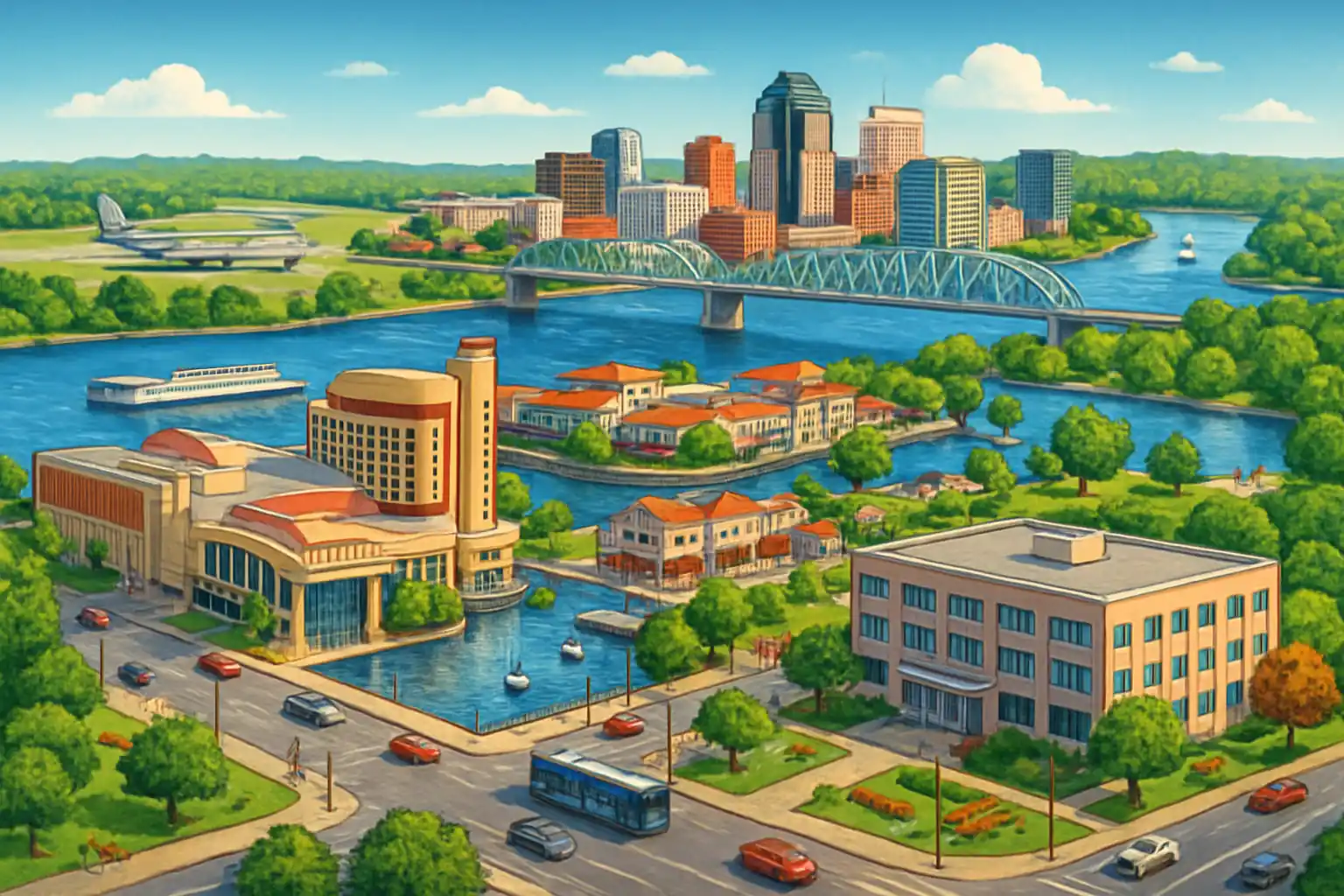 Bossier City och Shreveport bildar en tvillingstad med sammanlagt 400 000 invånare, sammankopplade av tre broar över Red River. Margaritaville Resort Casino och CenturyLink Center arena är landmärken längs Bossiers flodstrand, 2 km från centrum. Kör över Arthur Ray Teague Parkway-bron för att nå Shreveport centrum på 5 minuter och dess museer och restauranger.