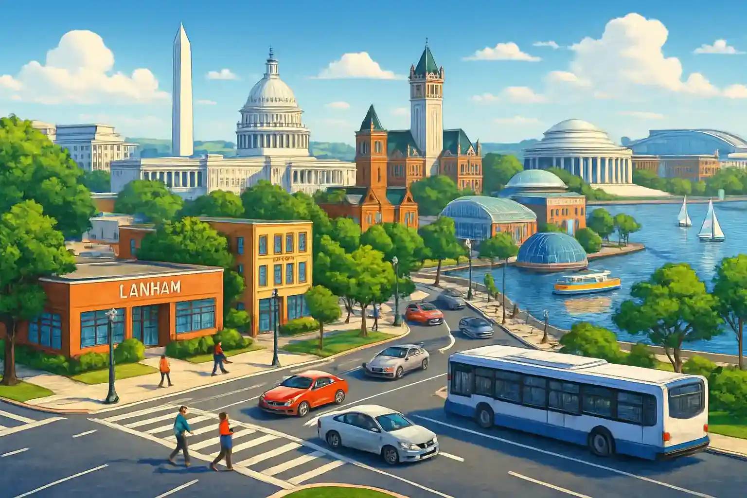 och Maryland. FedEx Field, hemmaplan för Washington Commanders, ligger bara 3 km bort. Lanham ligger längs US-50 (John Hanson Highway) med direkt koppling till I-495 och I-95.
