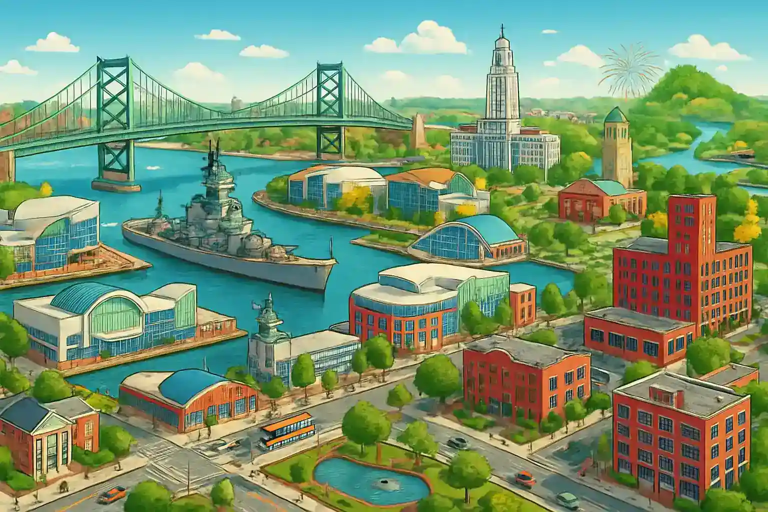 Philadelphia centrum ligger bara 3 km västerut via Ben Franklin Bridge, ungefär 10 minuters körning. Vad finns det att göra i Camden-området? Adventure Aquarium, Camden Waterfront Park och Battleship New Jersey Museum är de mest besökta attraktionerna längs flodstranden.