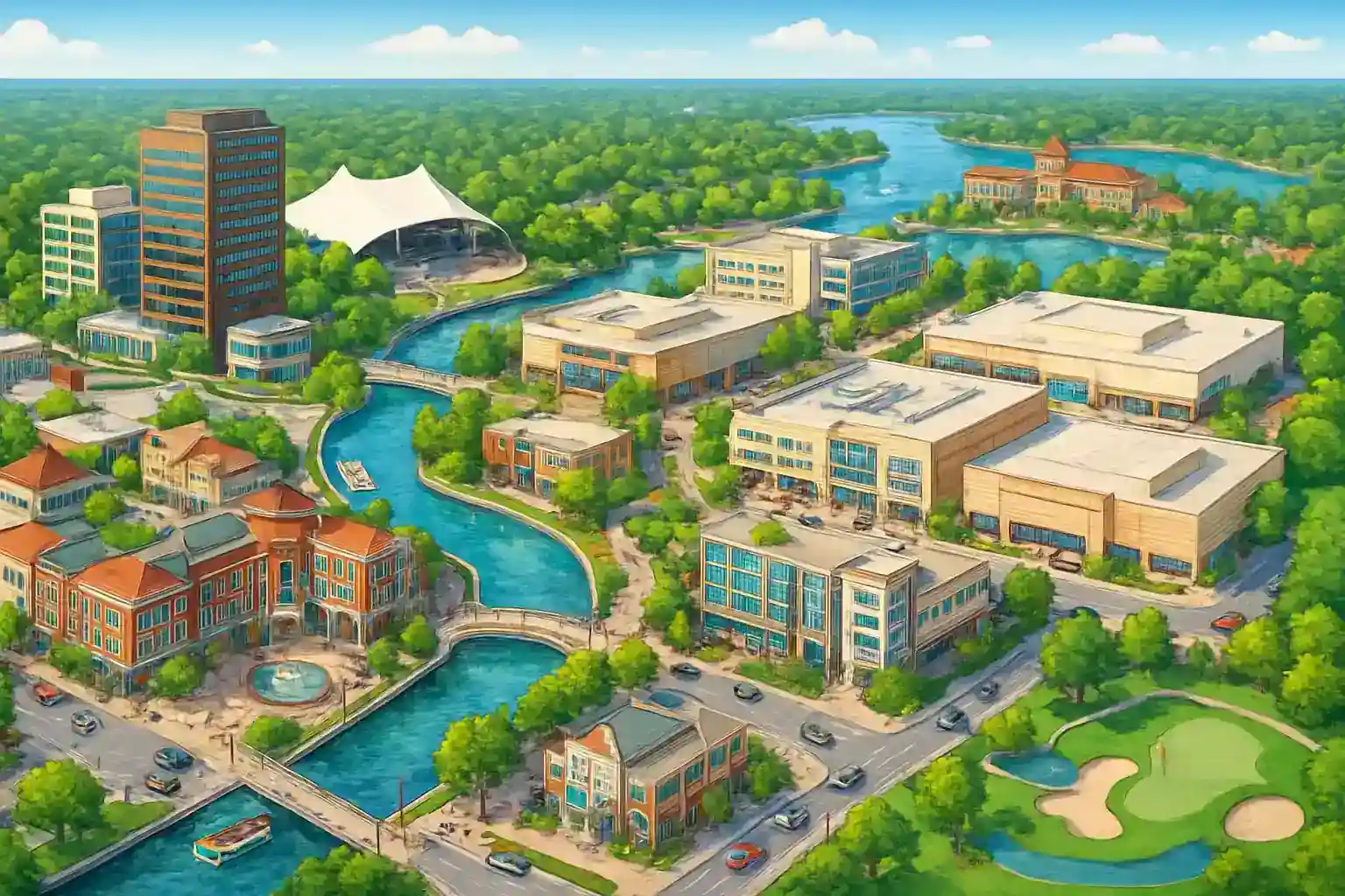 Hur långt är det från The Woodlands till Houston centrum? Houston centrum ligger ca 45 km söderut och nås på 40–55 minuter via I-45 South, beroende på trafik. Vad är The Woodlands Waterway?