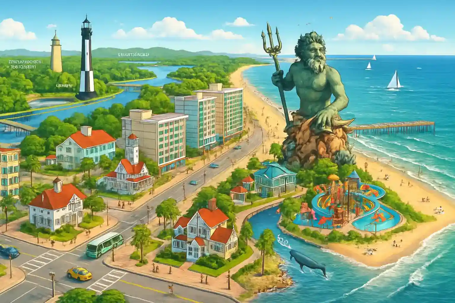 Virginia Aquarium & Marine Science Center ligger 5 km söderut, och historiska Norfolk nås på 30 minuters körning via I-264. Parkering längs strandpromenaden är avgiftsbelagd under sommarsäsongen – räkna med att betala 2–5 dollar per timme. Besök First Landing State Park, 10 km norrut, för vandring och kajakpaddling i naturskön miljö.