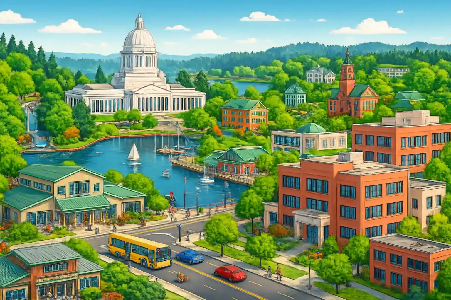 Boka bilen i förväg under Legislative Session (januari–april) då efterfrågan ökar markant. Parkering i centrala Olympia är begränsad – välj ett fordon av kompaktstorlek. Hur långt är det från västra Olympia till Seattle?