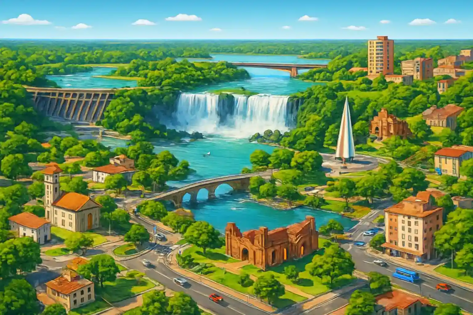 Från IGR till Parque Nacional Iguazús argentinska entré är det bara ca 8 km, vilket tar ungefär 10 minuter. Puerto Iguazú centrum nås på ca 25 minuter norrut. Brasilianska Foz do Iguaçu och dess fallutsikt ligger ca 35 km via gränsövergången Puente Tancredo Neves.